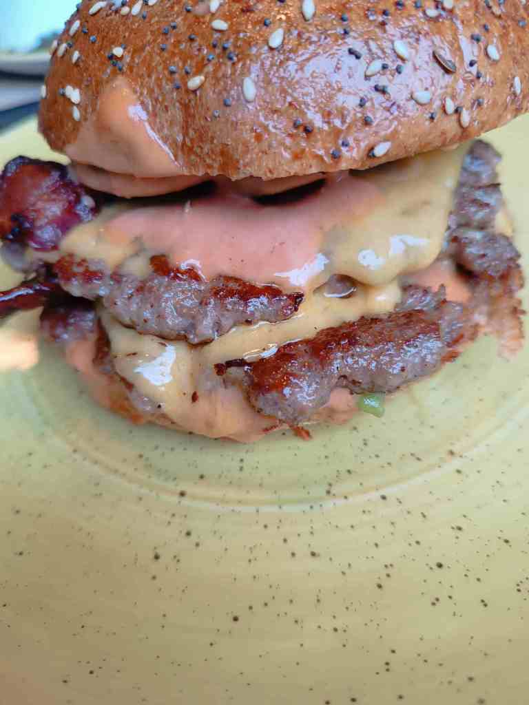 Mit einer Arbeitskollegin, die nur noch ein paar Monate da ist, essen gewesen – smashed Burger mit Käse