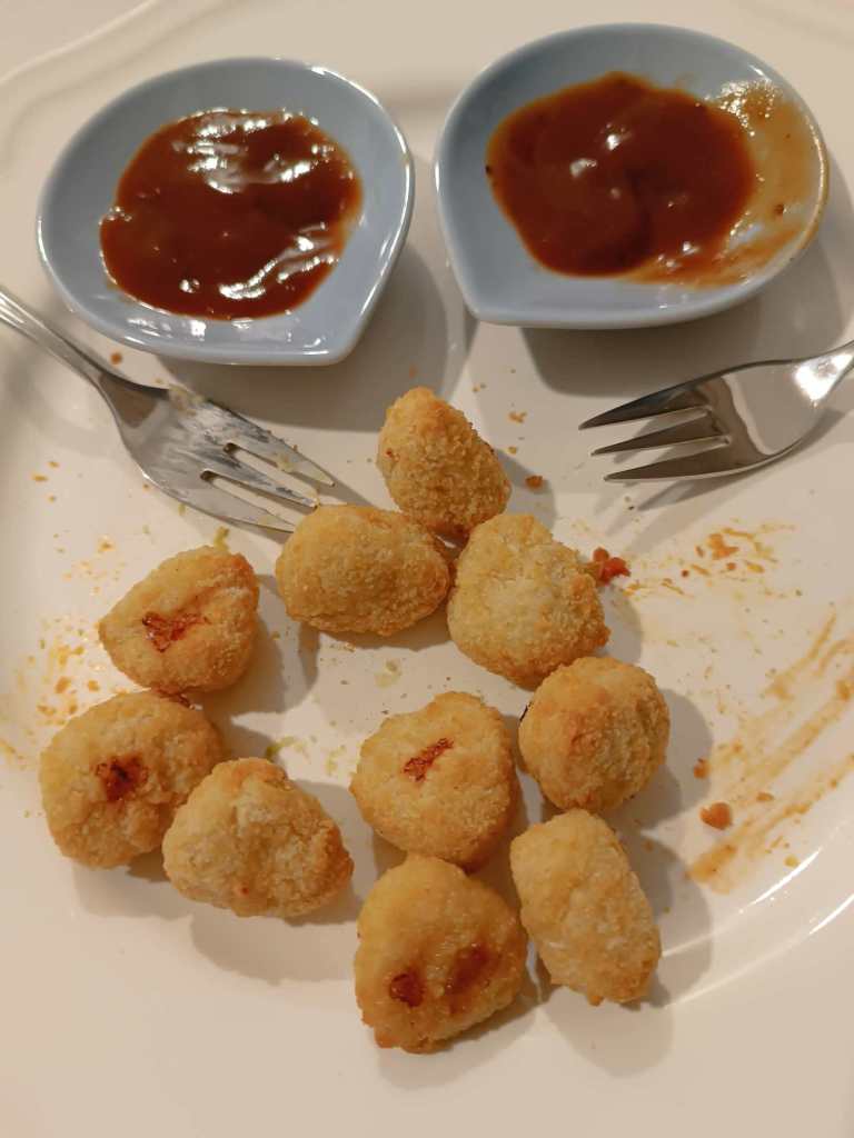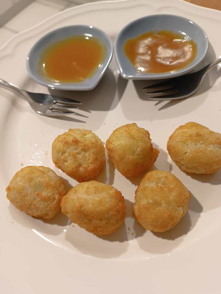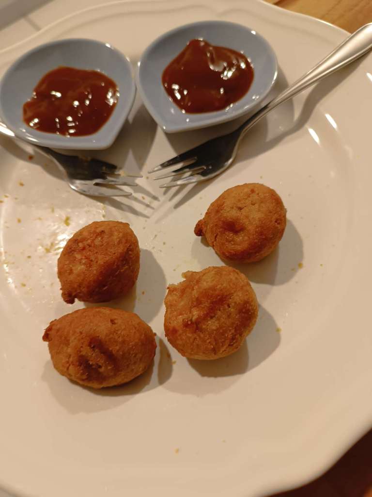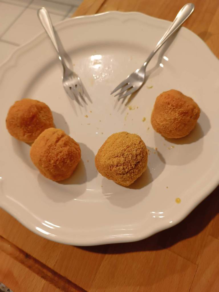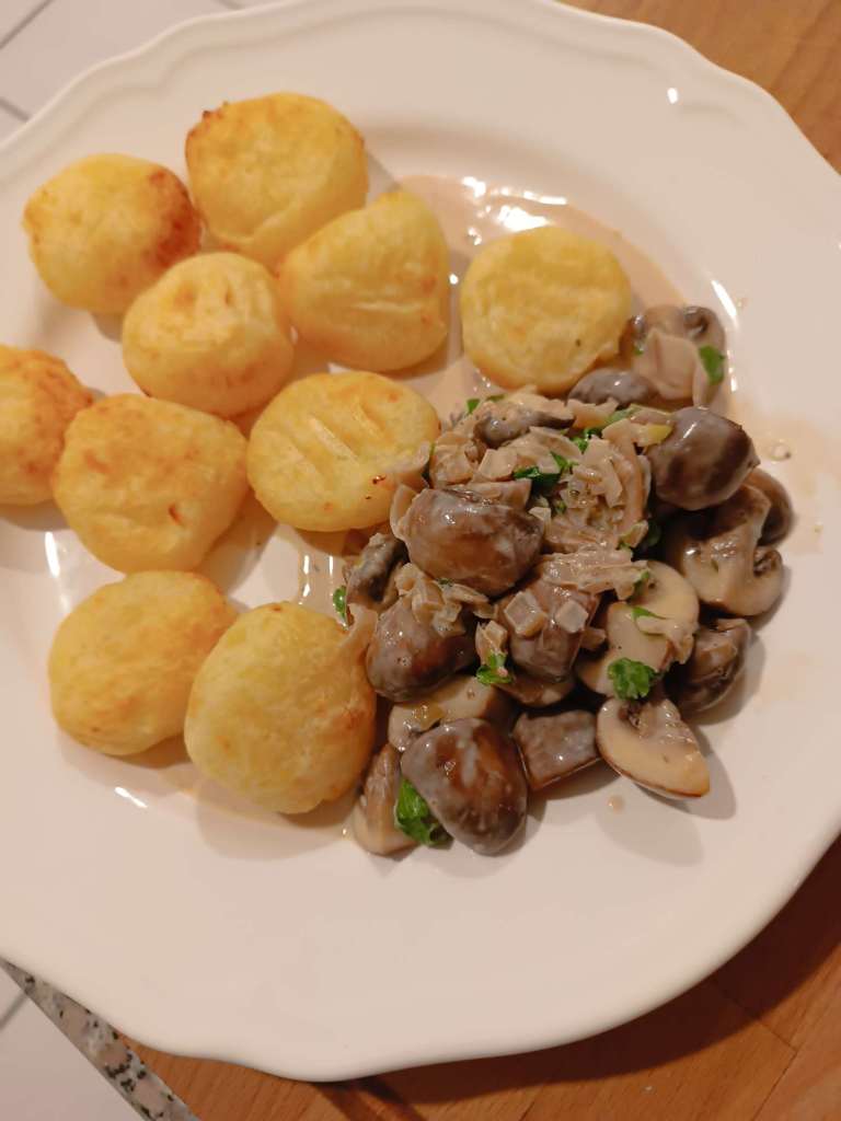 Klösschen aus fertig Klossmasse im Airfryer „frittiert“, dazu (klassisch in der Pfanne) Champignons Sahne Sauce