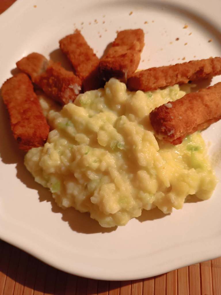 Fischstäbchen (gekauft) aus dem fryer, dazu Kartoffel – Gurken Stampf
