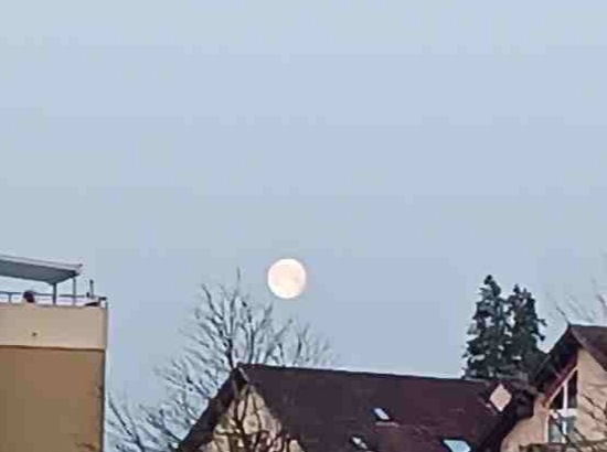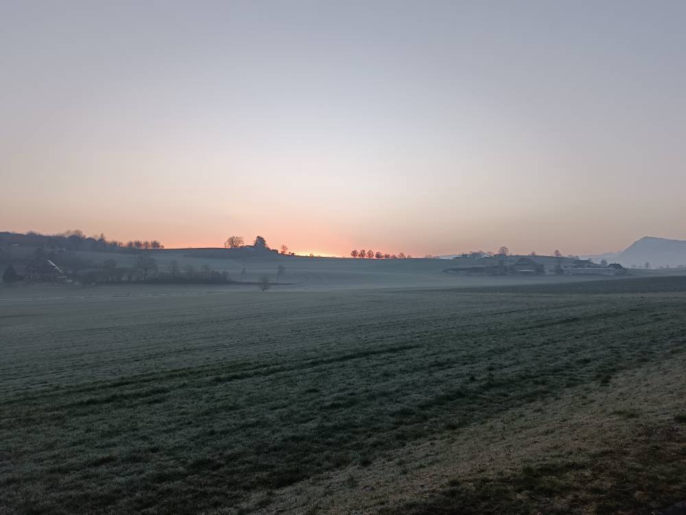 Der Mitschläfer steht heute 20 min vor meinem Wecker auf, er muss früh zum Job, da stehe ich halt auch gleich auf, mache Kaffee und verschwinde dann ins Bad. Beim Rauskommen aus dem Bad erwische ich ihn noch an der Tür. Ich trinke meinen Kaffee und mit Zigarette und Handy warte ich, bis ich zum Zug gehen kann. Es ist hell. Ich habe den fast Sonnenaufgang und einen riesigen Mond gesehen