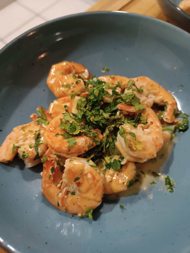 Garnelen mit Knoblauch, Koriander, Petersilie. Dazu Toastbrot.