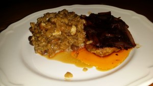 Miniquiche mit Lachs und Forelle, Steinpilzrisotto und Steak mit Balsamicosauce – das Bild ist jetzt nicht so der Knaller, aber geschmeckt hat es: