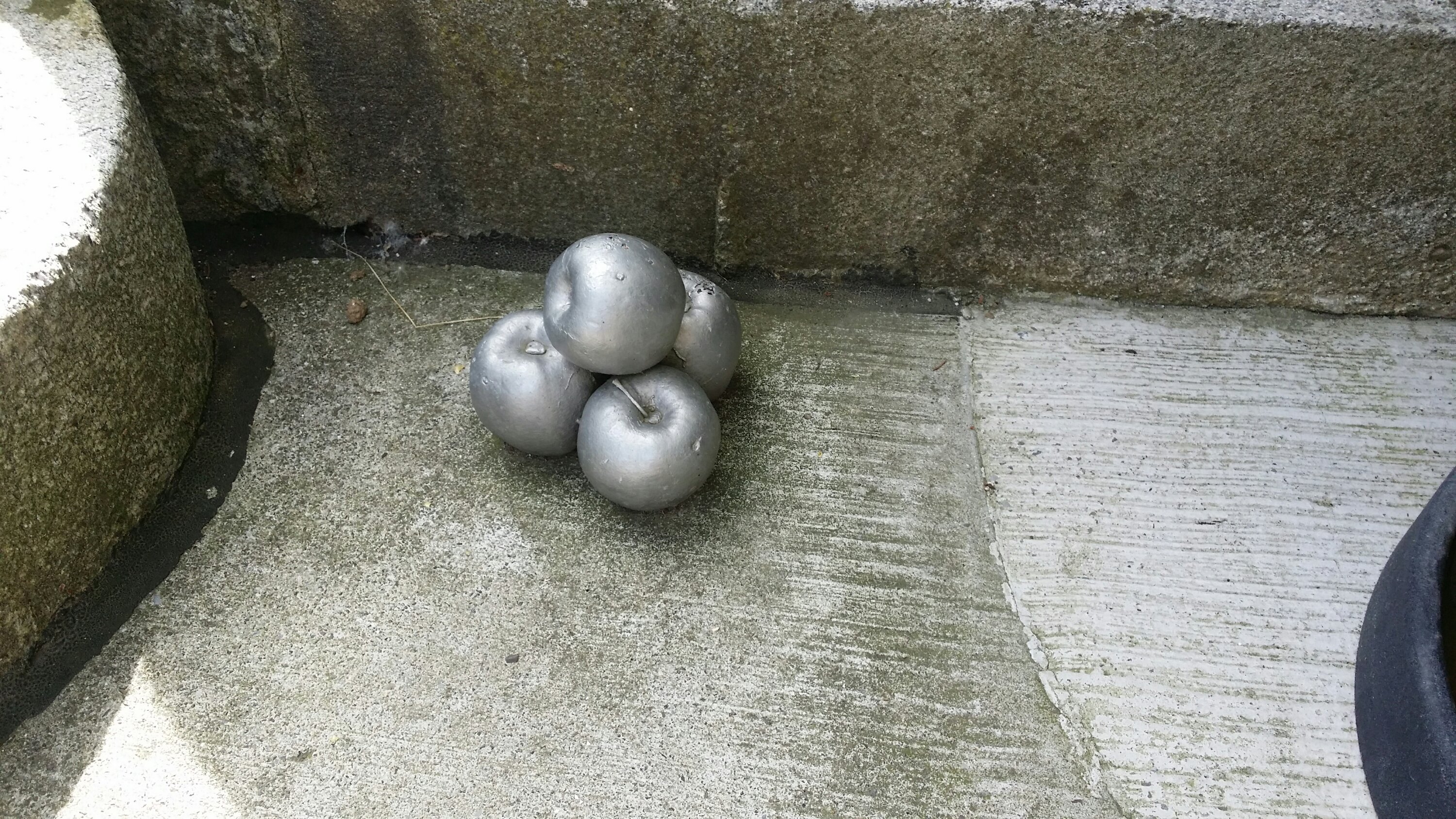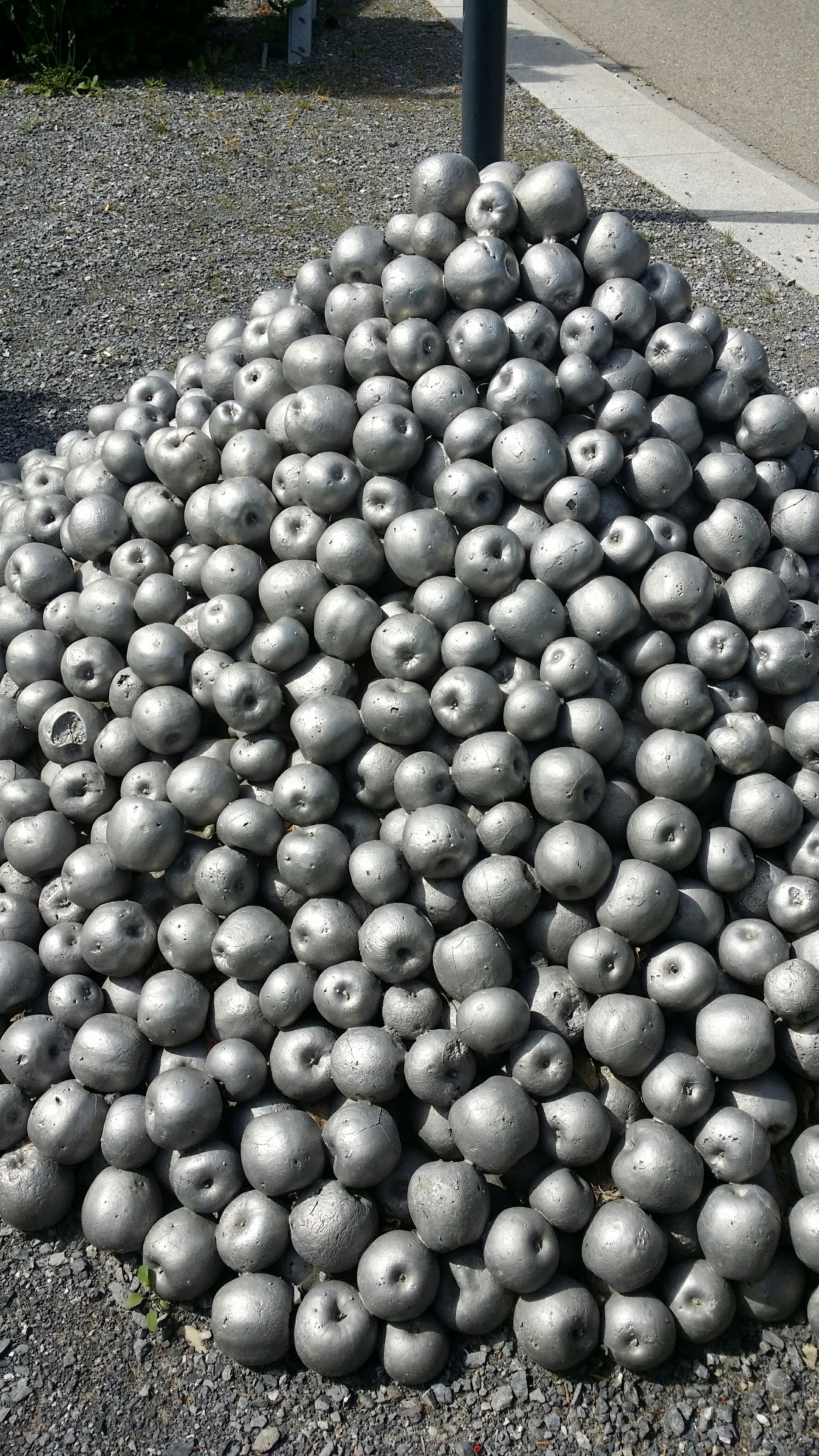 Am Morgen, als noch Liebe und Eintracht herrschte (da man von der raviolschen Katastrophe nichts ahnte), fuhren wir fürs Geocaching und einen Multicache in ein Städtchen, dass einen Grossteil seiner Identität aus Äpfeln bezieht. Aus diesem Grund sieht man in der ganzen Stadt silberne Äpfel – 1/2, 1, 2, 3, 4