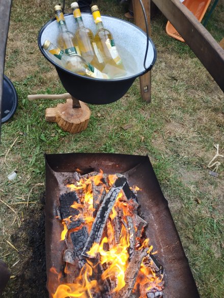 Bier, Met, Wein. Den Met angewärmt, weil leider Regen und kalt. Aber was ein richtiger Wikinger ist …
