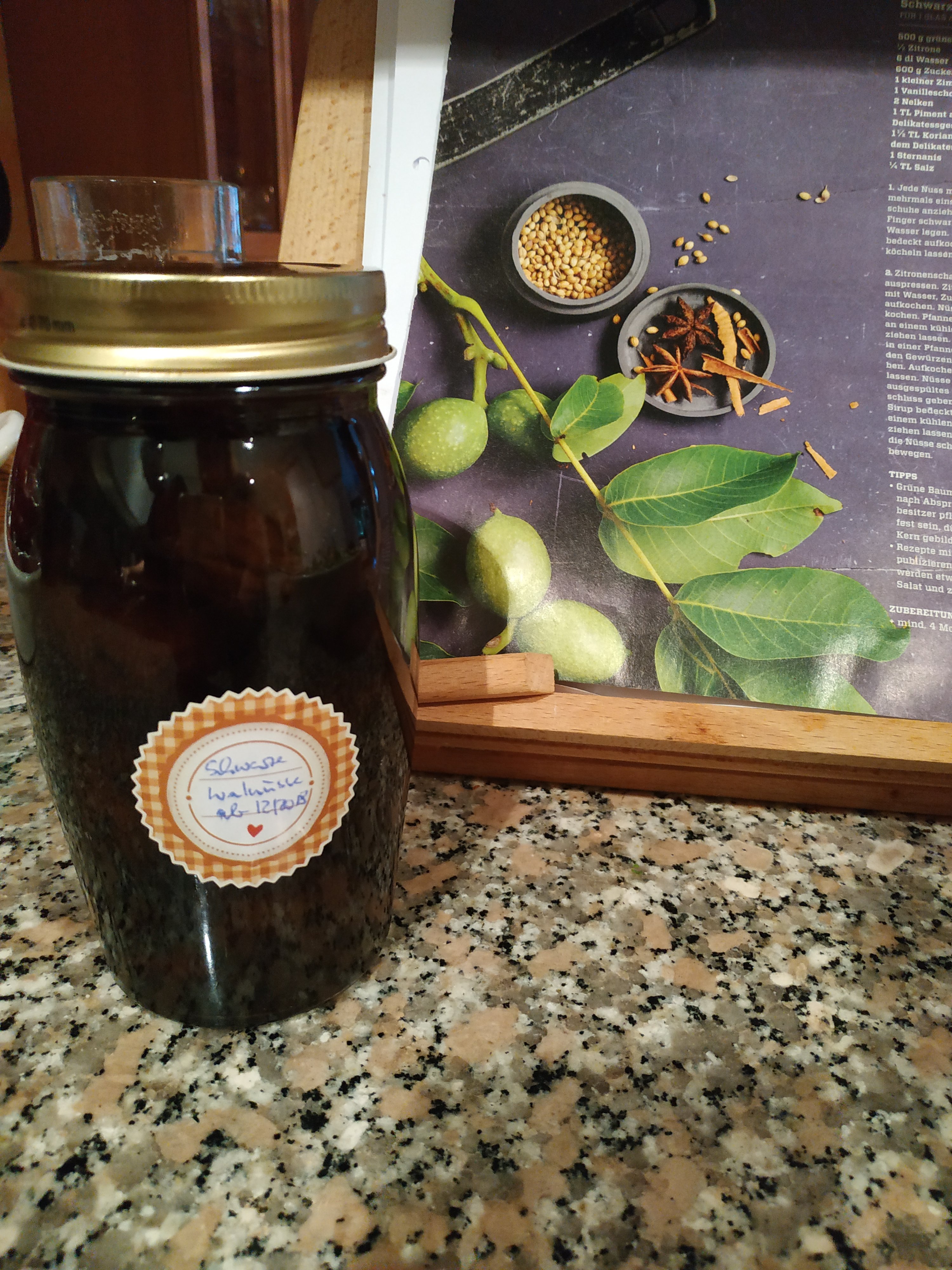 Die letzte Woche in Sirup aufgekochten und eingeweichten grünen Walnüsse noch mal aufgekocht und dann in Gläser abgefüllt. So müssen sie und ich jetzt 4 Monate warten