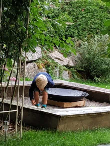 Der Vorteil von kleinen Besuchskindern, die gern zündeln, ist, dass sie alles für dich machen. Jäten im Feuerschalensandkasten z.B.