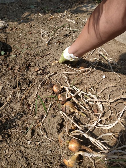 Noch ist es ganz angenehm, also Zwiebeln geerntet, bevor sie gebraten werden, das soll ja in meiner Pfanne passieren