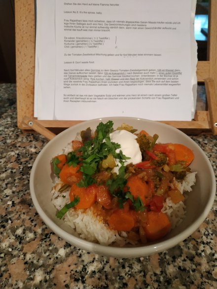 Mir ist nicht nach Fleisch und so wird ein vegetarisches Curry gekocht, was ich eh schon lange ausprobieren wollte und genug Gemüsereste waren auch da.