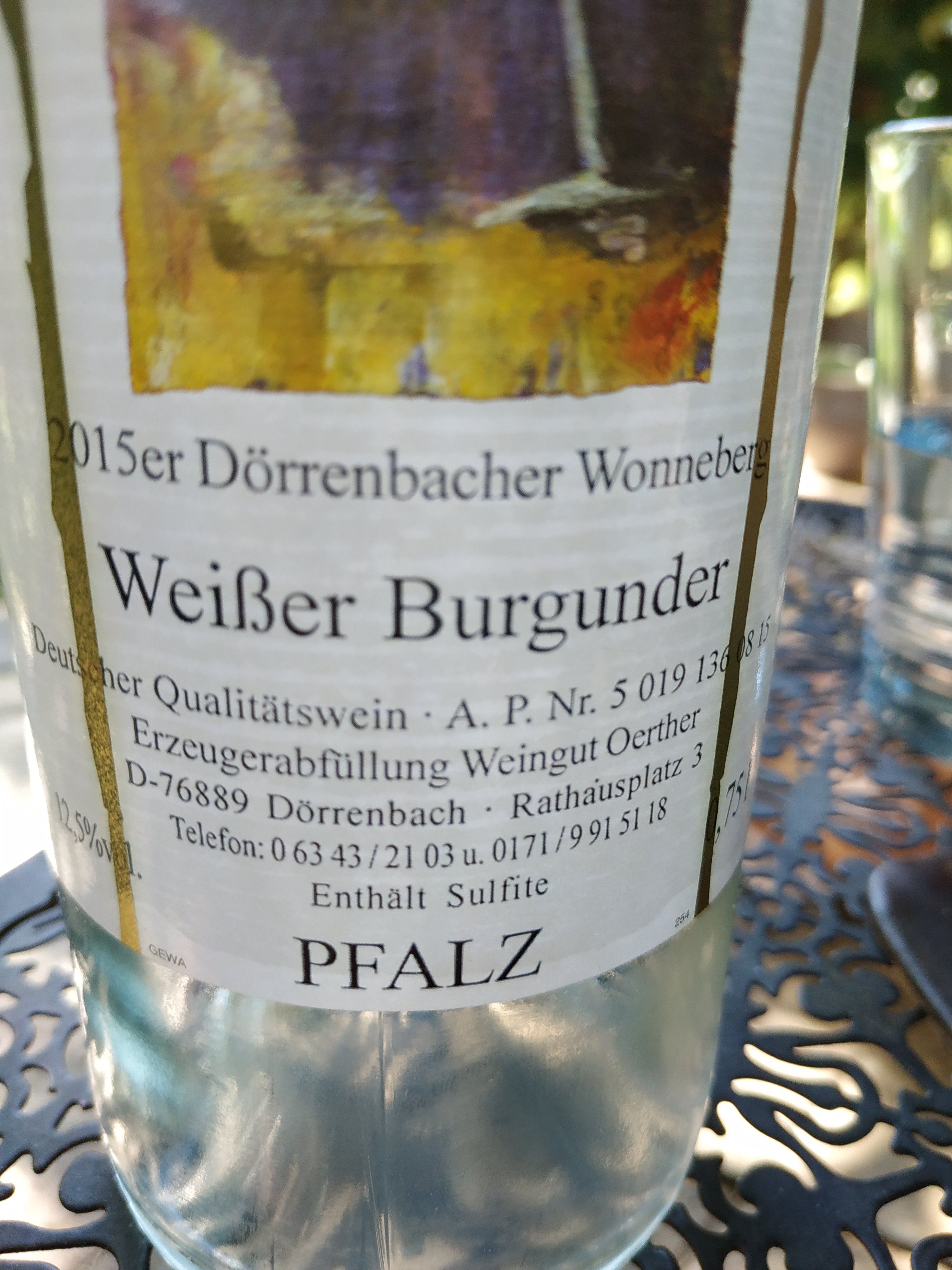 Weissburgunder: sehr dunkle Farbe, sehr intensive Nase (beides nicht unbedingt typisch), am Gaumen erst würzig, dann etwas matt, kurzer Abgang.