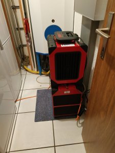 Auf Grund des Wasserschadens (über uns ist wohl ein Zulauf zum Warmwasserboiler defekt gewesen), haben sie uns so ne Trockner / Entfeuchter / was weiss ich hingestellt (mein Strom, mein Geld!!). Die laufen jetzt Tag und Nacht und machen einen übelsten Krach. Tür zumachen darf man aber nicht. Na gut, die Woche ist bald rum, dann holen sie sie wieder ab