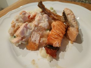 Lachsrisotto: Öl/Butter und Reis (keine Zwiebeln), Brühe, am Schluss Sahne, Parmesan, Lauch (hatte ich nicht, hab ich Frühlingszwiebeln genommen) und Lachs unterheben, 3 Minuten garen. War sehr gut, das nächste Mal etwas mehr Zitrone und Salz. Den restlichen Lachs und die Haut extra angebraten und dazu serviert.