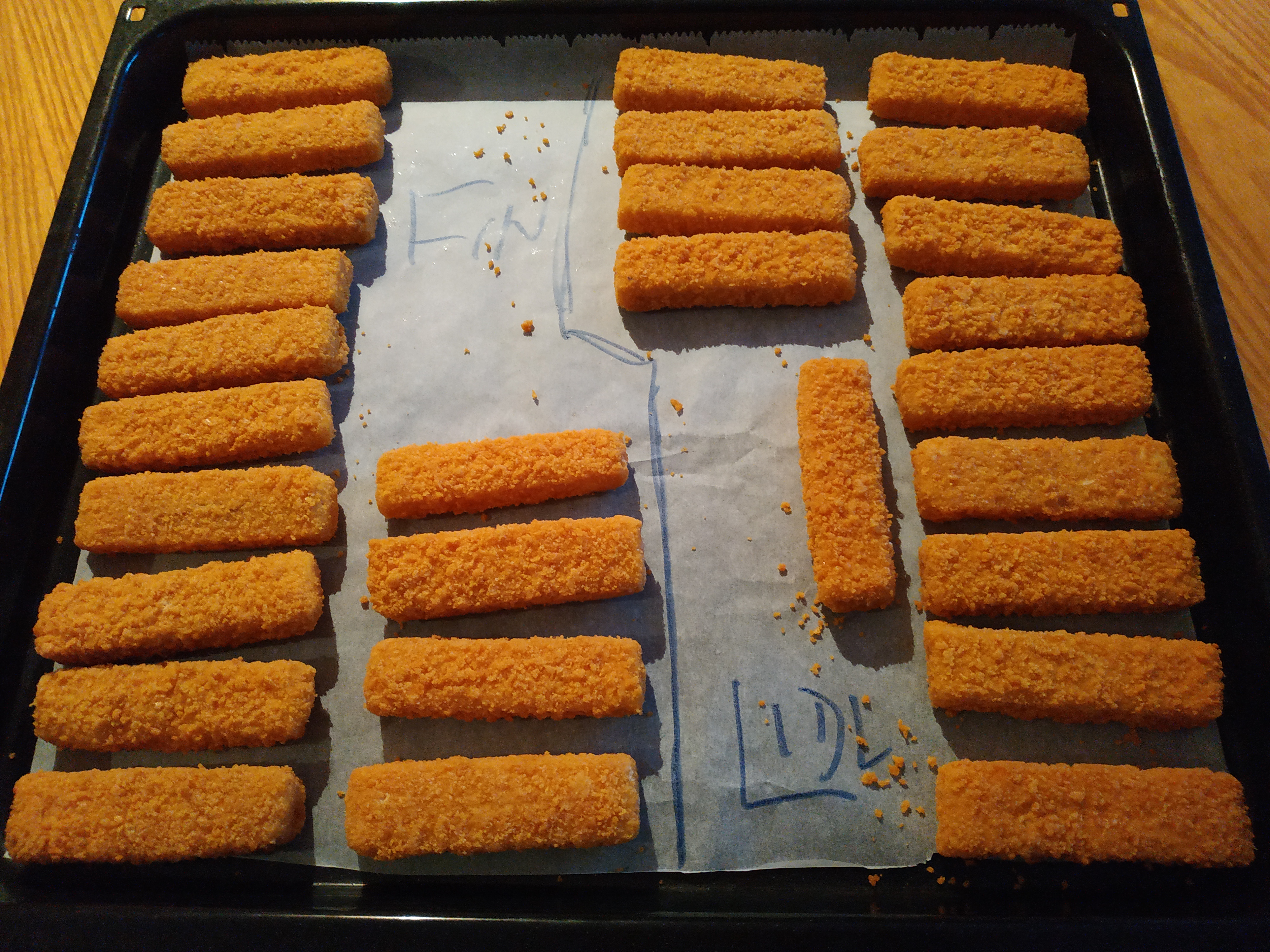 Mir war dermassen nach Fastfood – Fischstäbchen. Durch die gestrige Sendung bin ich auf die Idee einer Blindverkostung gekommen, also die teuren (Findus) und die günstigen (Lidl) gekauft, im Backofen zubereitet (das ist wohl kalorientechnisch besser, schmeckt aber nicht so gut) und probiert: beide gleich. Hab ich das auch geklärt.