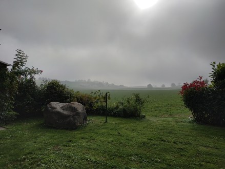 Alles immer mal unterbrochen von Zigarettchen und Bierchen und Weinchen, was auf der Terrasse getrunken wird. Dabei sehe ich in den Nebel (morgens)