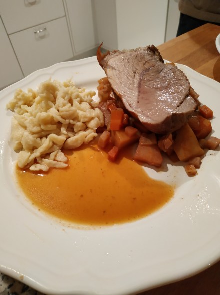 Es sollte geschmorte Lammkeule geben, allerdings gab es ein Problem mit dem Lamm, also seiner Keule – letztendlich hatte ich keine, sondern nur Schweinebraten. Hab ich den halt nach dem gleichen Rezept gekocht (Mohrrüben, gelbe Rüben, Pastinak, Fenchel, Rotwein) – einfach kürzer geschmort (die Lammkeule hätte 4 Stunden gebraucht, das Schwein halt nur knapp 2)