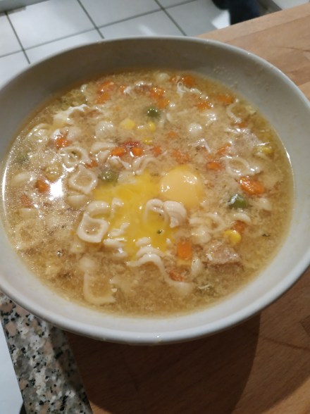 Heute war ich faul und müde. Hühnernudeltopf aus der Dose, verfeinert mit Sojasauce, Sambal Olek, Eiweiß und zum Schluss das Eigelb