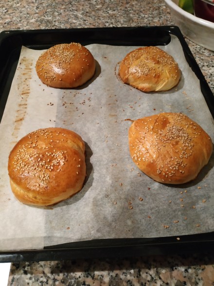 Zweierlei Burger: asiatisch (Peperoni, Koriander, gehackte Erdnüsse, süsse Chillisauce) und französisch (Burger mit Brie gefüllt und den Bun mit körnigen Senf bestrichen). Die Buns natürlich selbst gemacht