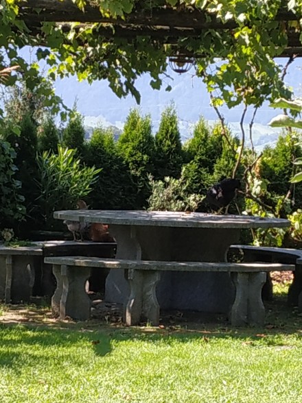 Die Hühner picken die Weintrauben auf (auf dem Foto ganz rechts, das schwarze Huhn), die runter fallen. Das Drama wie bei Max und Moritz möchte ich aber nicht erleben 😉