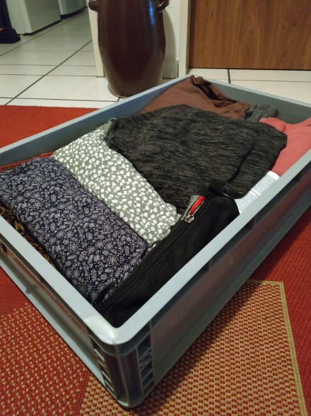 Klamotten, diverses Campingbuszeug (eine Woche bin ich in einem Ferienhaus, die zweite Woche geht’s aber einfach so durch Polen) – ich hab nur eine Kiste, da muss alles rein. Meine Kombifähigkeiten sind gefragt