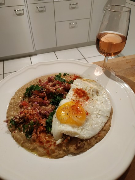 Selleriepüree mit pikantem Blumenkohl (ohne Wachteleier, hatte ich gerade nicht da 😉, habe ich normale Eier genommen, geht auch) nach Ottolenghi