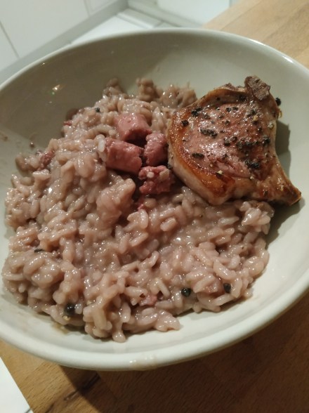 Wurstrissotto (Schalotten andünsten, dann Salsiccia anbraten, dann Reis dazu, dann mit Rotwein ablöschen und dann wie immer)