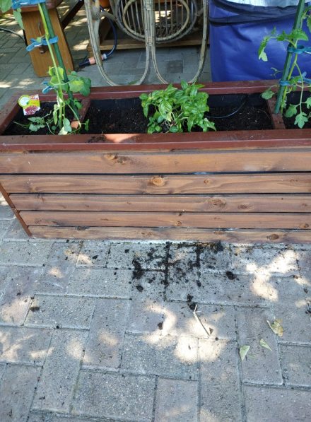 Tomaten gepflanzt (eine Sorte heisst Traubentomate – klar, dass ich die gekauft habe), dazwischen Basilikum, den ich mal gekauft und der es bis jetzt geschafft hatte