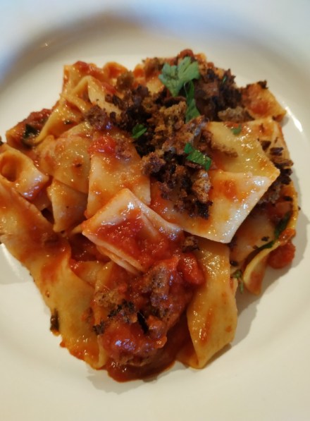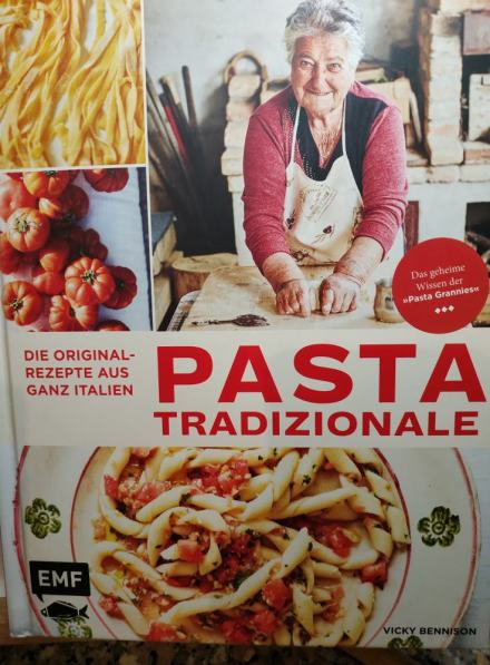 Selbstgemachte Tagliatelle (nur Mehl und Wasser) mit Tomaten Sardellen Sauce, als Topping Brotkrümel nach diesem Buch