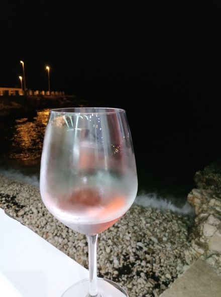 Auf einem Platz in Giovinazzo. Sehr windig, aber direkter Meerblick. Sehr sehr windig – mein Weinglas muss immer gut gefüllt sein, sonst fällt es um 😉