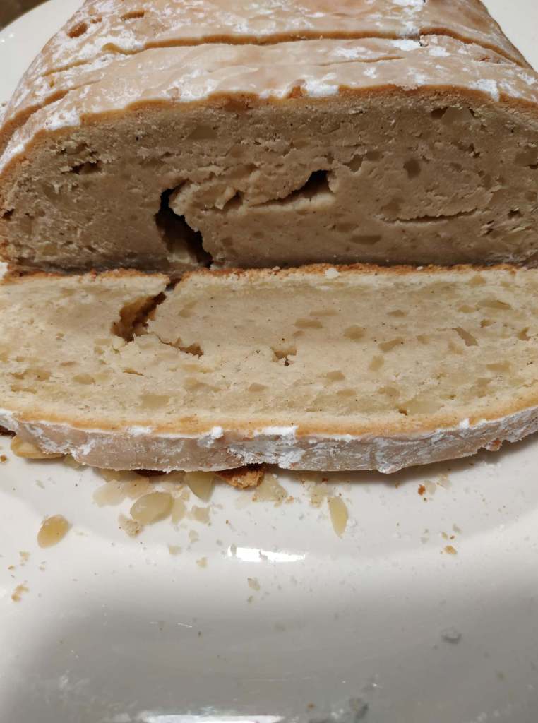 Mandelstollen, mein Kartoffelsalat, Gemüse mit Würsten, Lachs, Roastbeef, Reissalat, Desserts