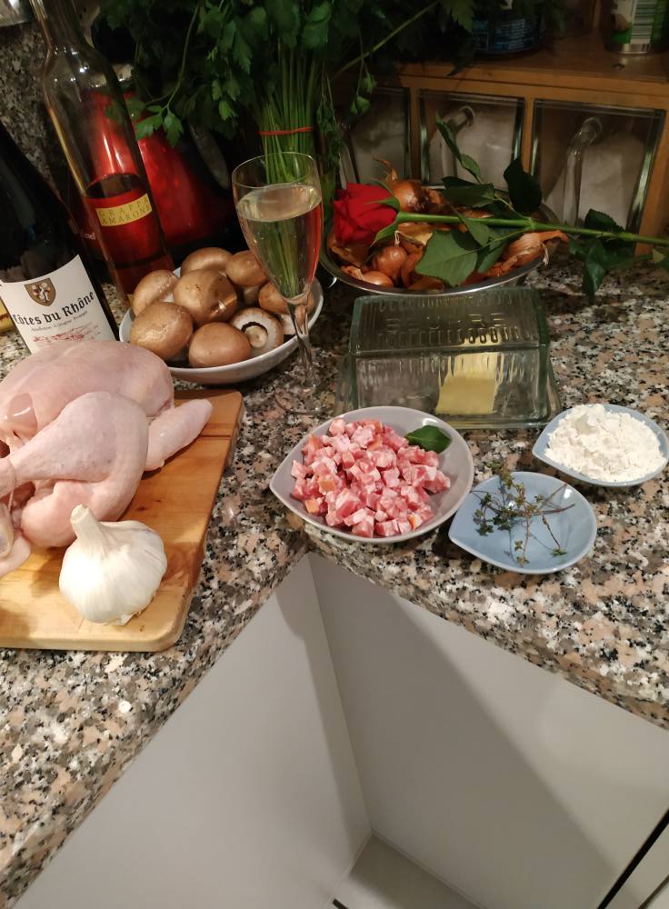 Dann gehe ich ins Bad, rausgehfertig herrichten. Ich sammele Schmutzwäsche ein und auf dem Weg zum Einkauf gehe ich im Keller bei der Waschmaschine vorbei und stopf das Zeug rein, dann ist es gewaschen, wenn ich heimkomme (Ich Füchsin!). Ich kaufe ein paar Zutaten für das Essen und Prosecco, den es im Angebot gibt, zum trinken und diverse andere Kleinigkeiten ein, ausserdem dunkelrote Rosen. Die Stimmung wird besser. Draussen liegt ein bisschen Pulverschnee, das ist nett. Zurück zu Hause hänge ich die Wäsche auf. Dann gibt es ein Glas Prosecco und dann geht das Kochen los. Heute coq au vin – ich nehme Cotes du Rhone