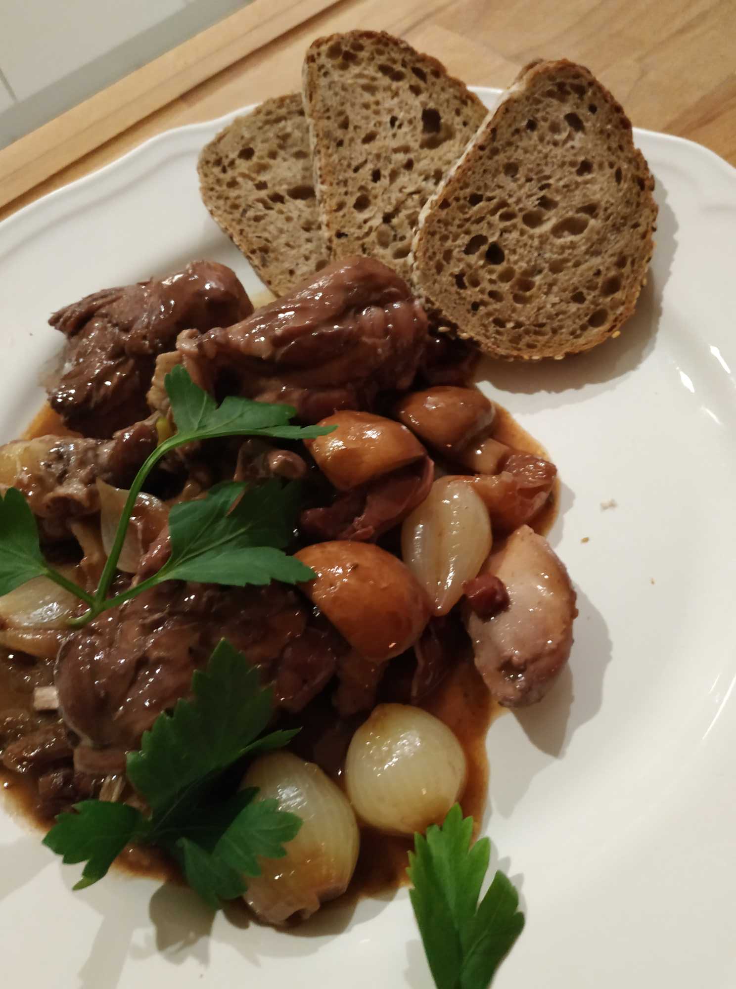 Portugieser Weissherbst aus Opfingen (mir zu „bonbonig“). Beim Kochen gemerkt, dass ich für die Sauce Weisswein brauche (ich Schussel), Weissurgunder (auch aus Opfingen, habe ich das Weingut/Winzergenossenschaft dann durch). Da ich morgen frei habe (Feiertag, Maria vielmehr ihren Eltern Dank), geht das schon. Um das mal klarzustellen – natürlich trinke ich nicht 2 Flaschen Wein, ich pumpe den Rest ab und trink / verkoch den dann die nächsten Tage. Der Weissburgunder sehr gut, obwohl Jahrgang 2017 sehr frisch