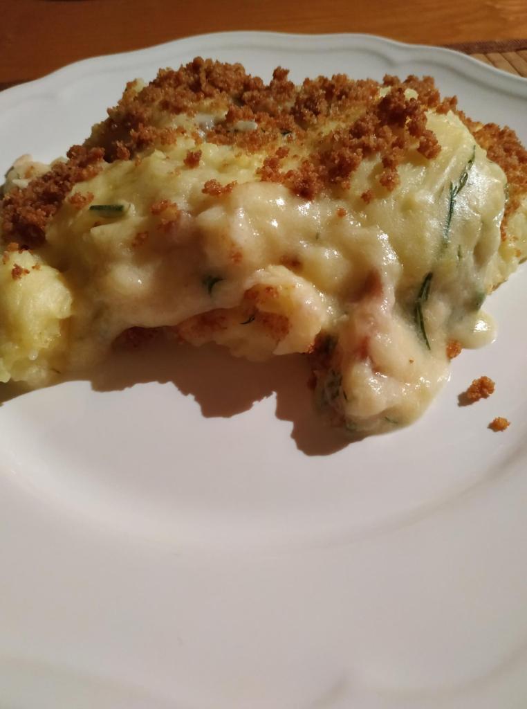 Für das England Wochenende hatte ich u.a. auch Stremellachs gekauft, weil es als Vorspeise eine Art Lachs Törtchen geben sollte. Wir hatten aber so viel (zu kochen, zu trinken, zu reden), da ist das ausgefallen, Er muss aber weg, also heute nochmal das Fisch Pie, was ich letztens schon hatte. Diesmal mit weniger Sauce. Sieht wieder nicht doll aus, aber war wieder lecker