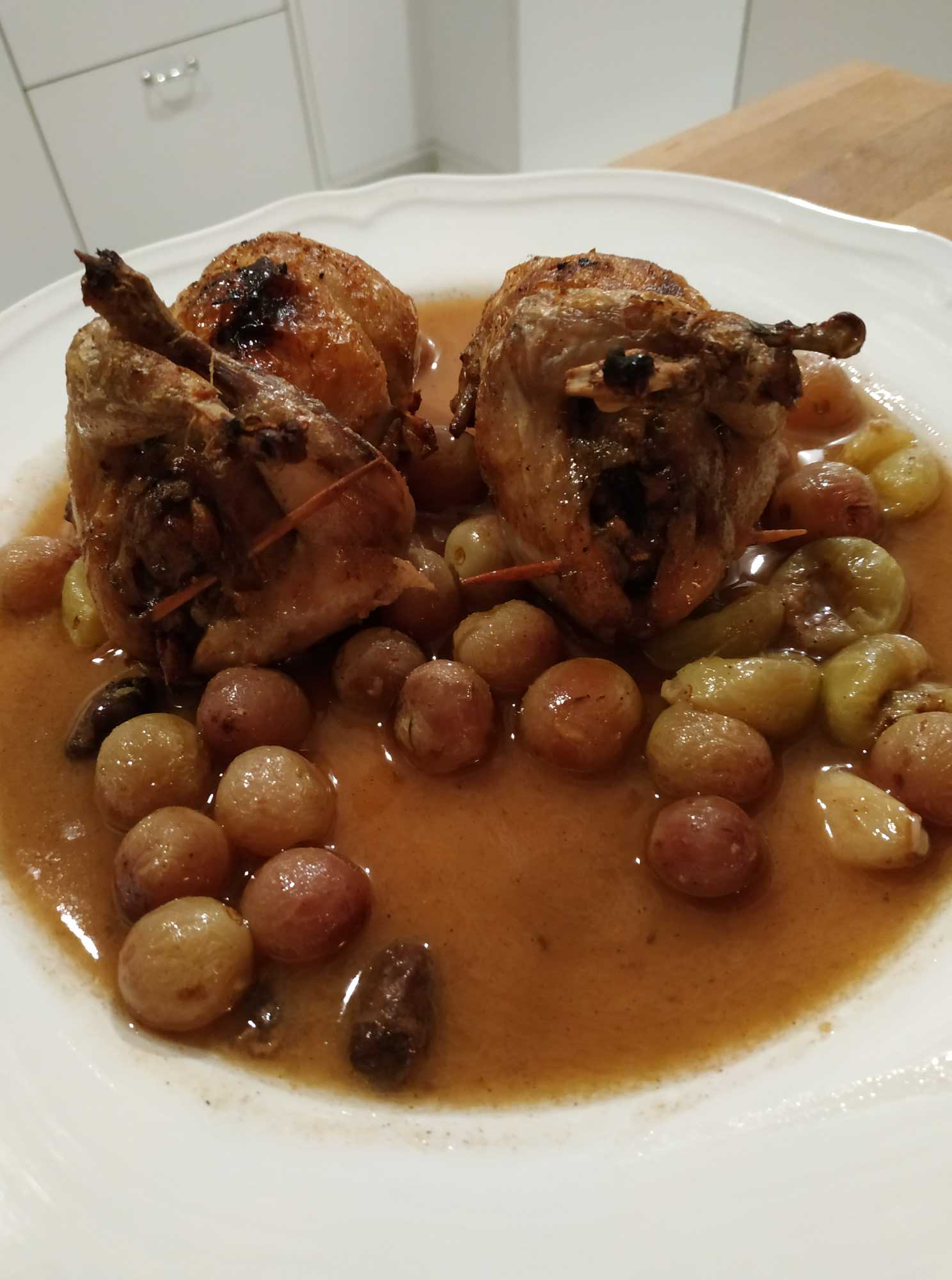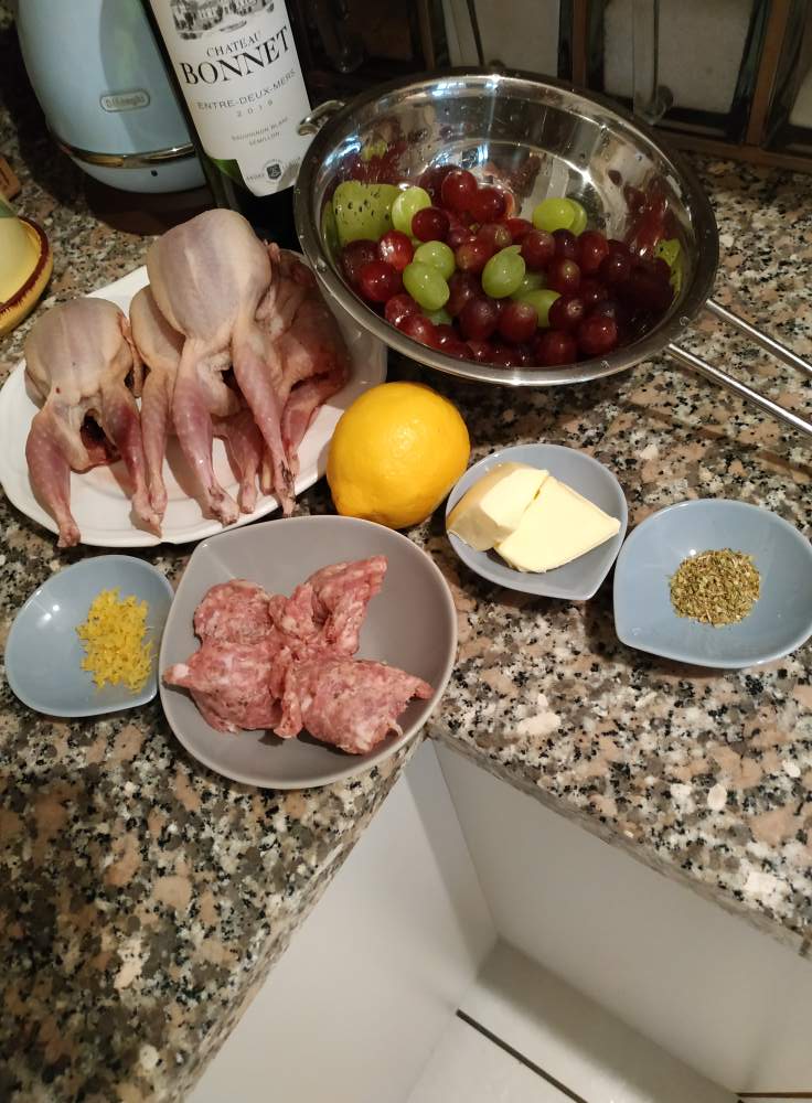 Quaglie al vignaiolo – Wachteln auf Winzerart (gefüllt mit Bauernwurst). Dazu Baguette. Sehr lecker!