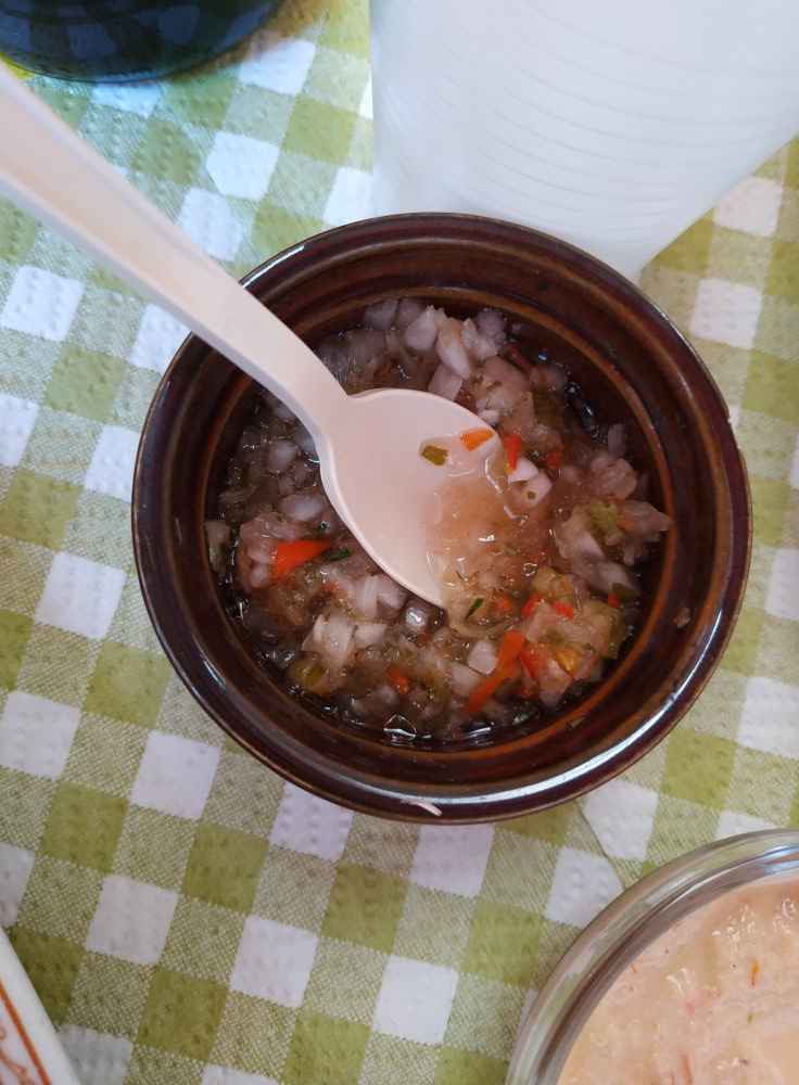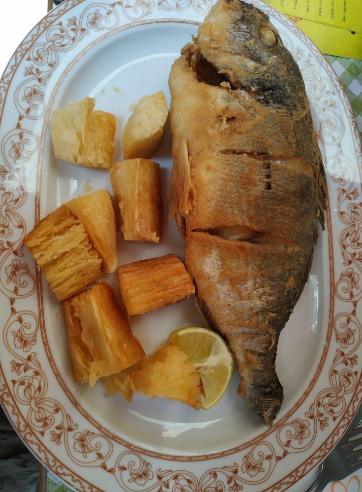 Gestern habe ich in einer Bar 2 Peruaner getroffen, die von einem kleinen Restaurant erzählt haben. Da bin ich heute hin und habe frittierten Fisch mit Yucca gegessen, dazu gab es einen frisch gemachten Dip