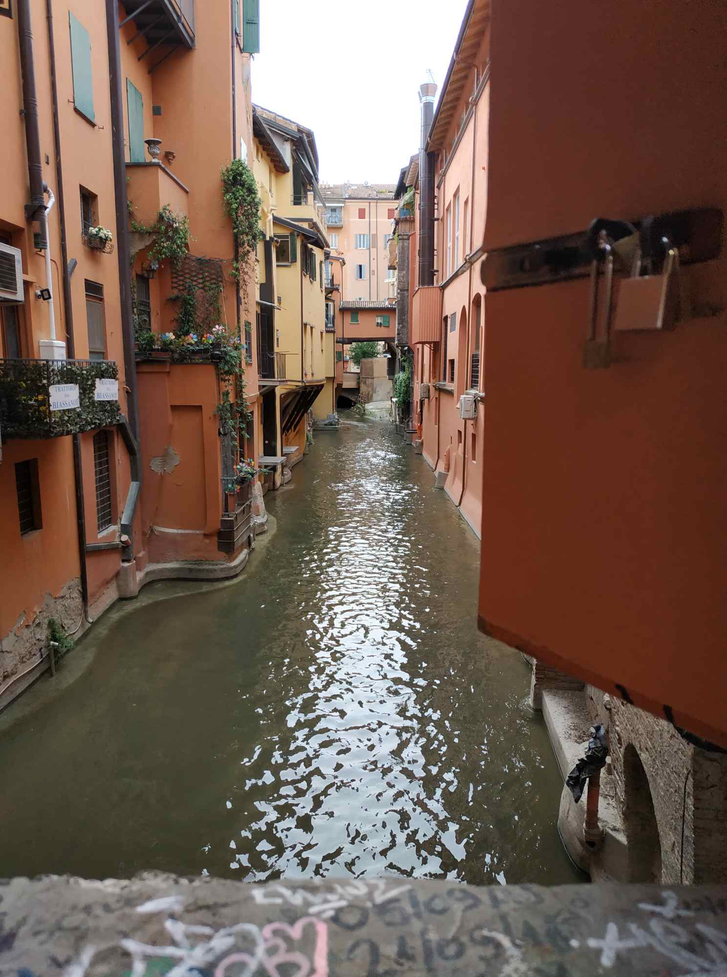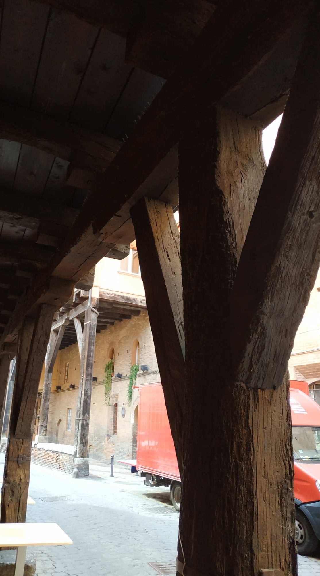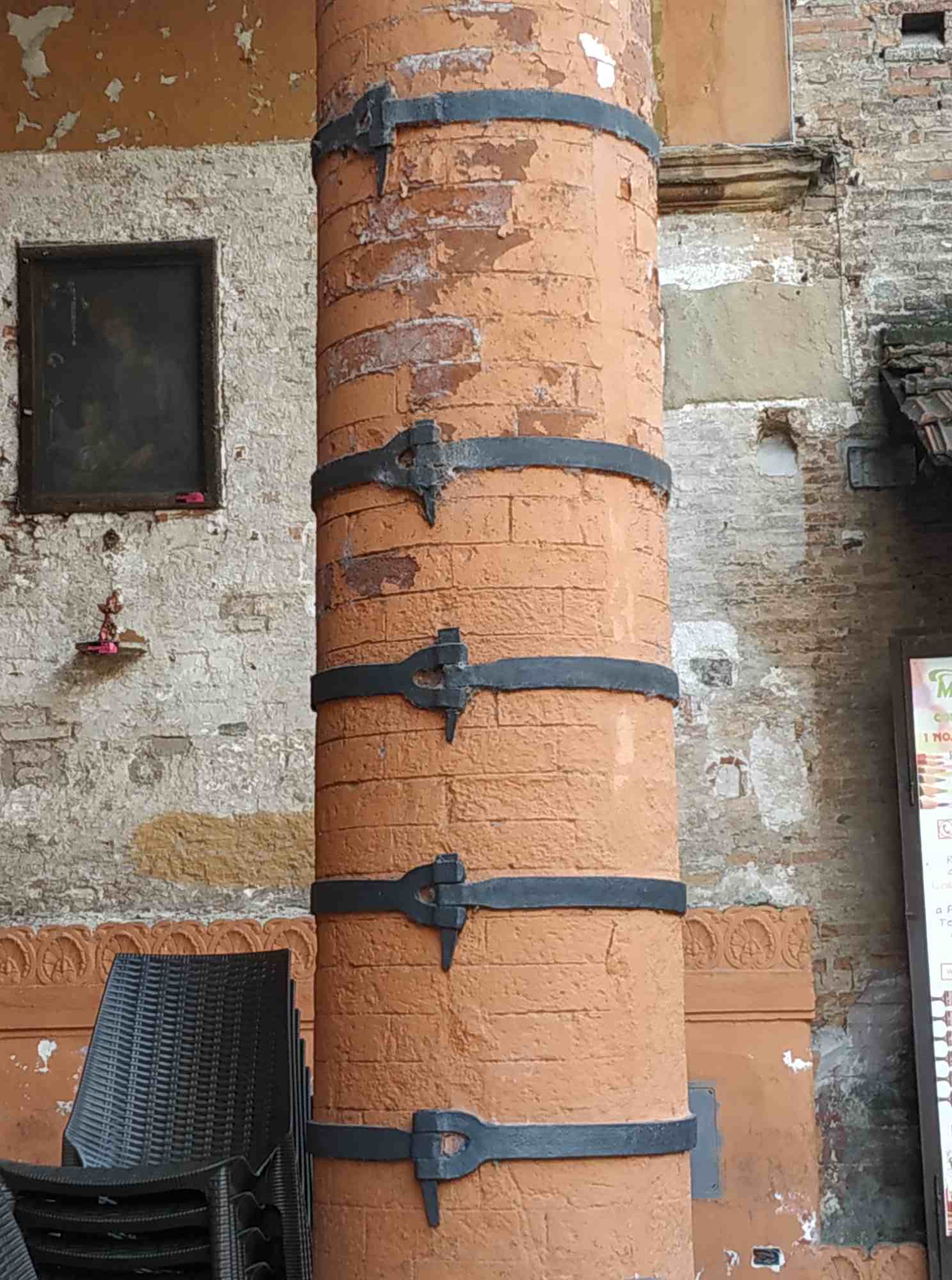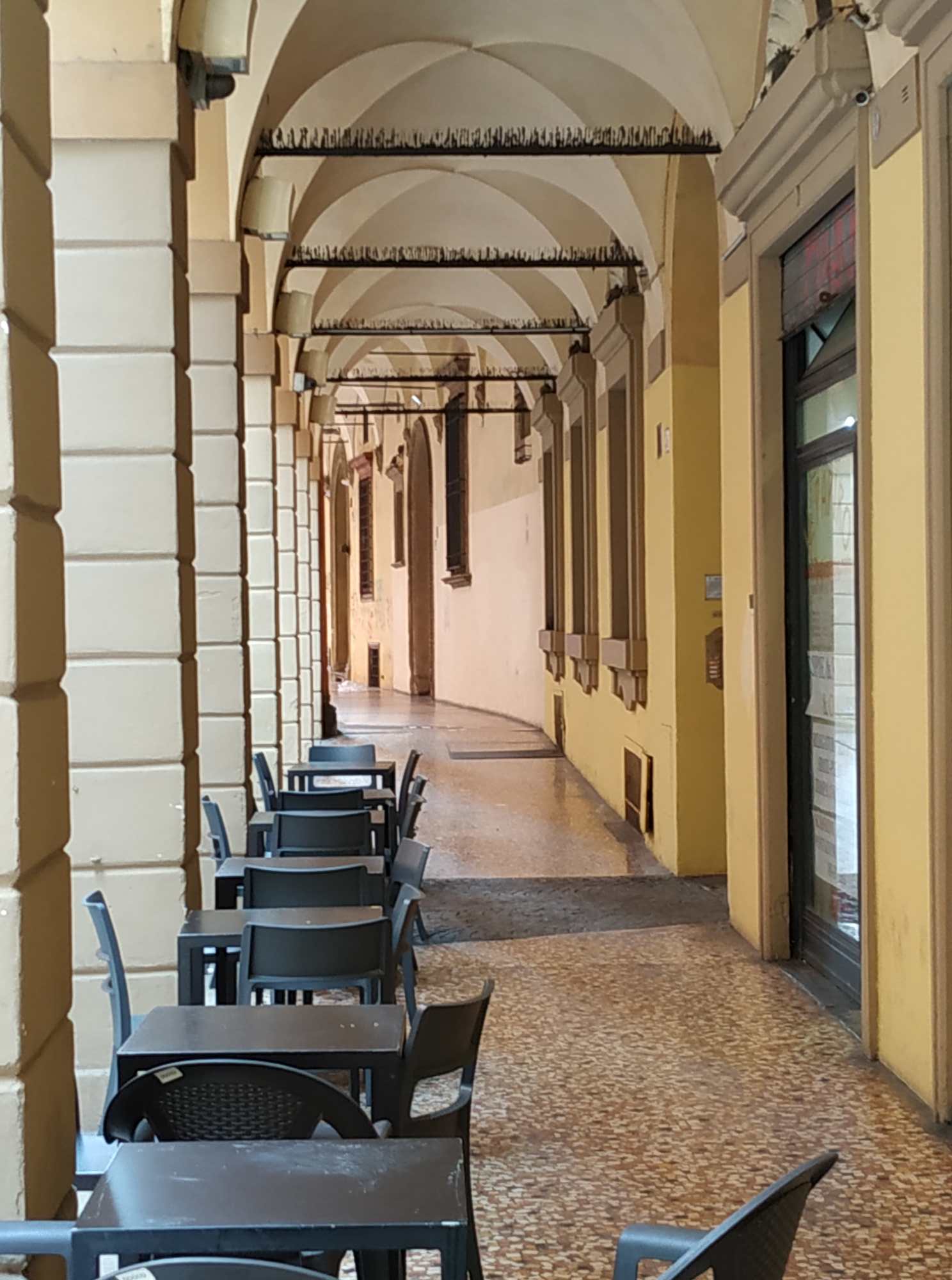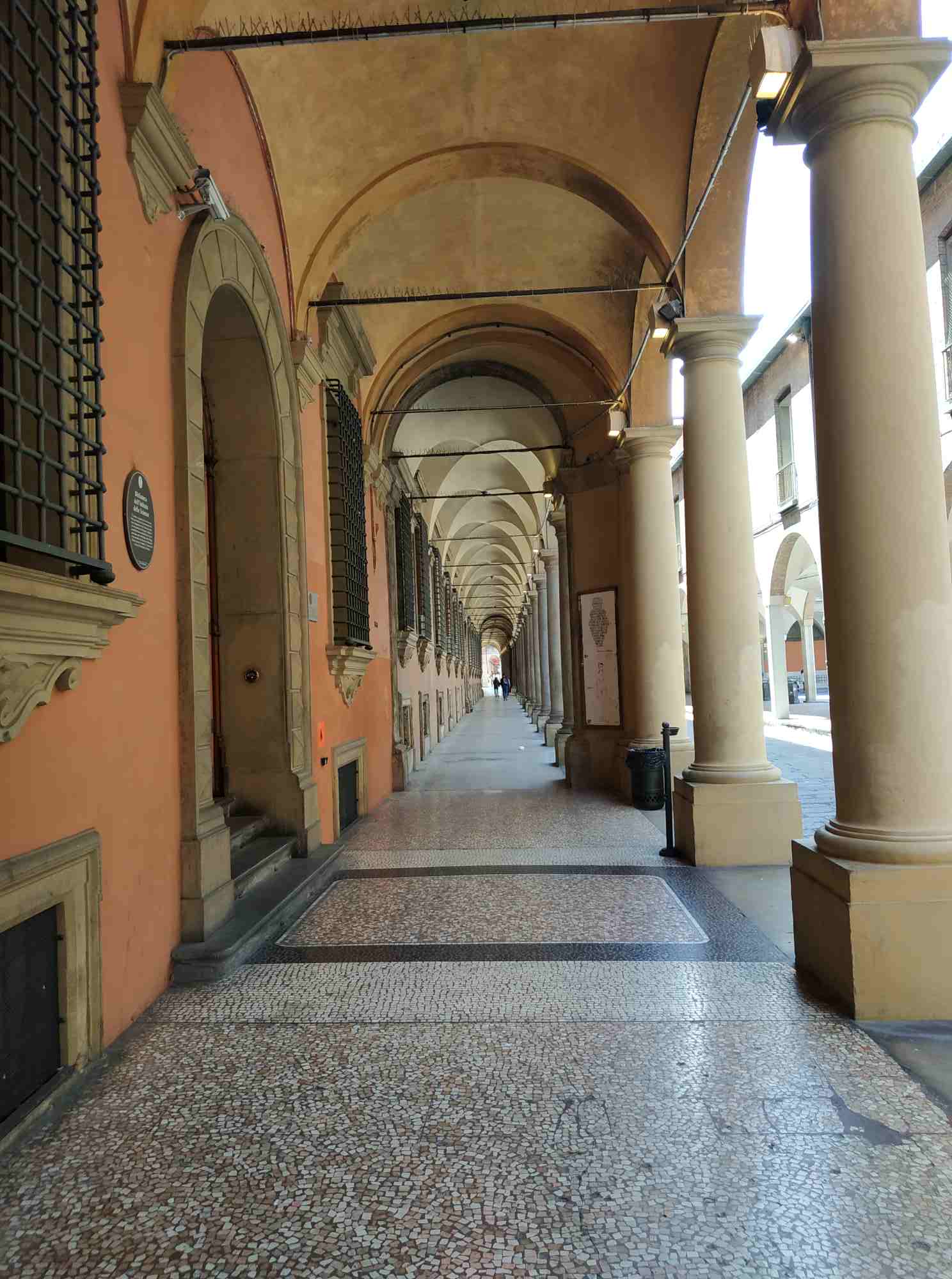 gefühlt 100 km durch die Portici (Arkaden), manche mit Holz, manche ewig lang mit Kurve, so dass ich natürlich gucken musste, was da kommt. Manche Säulen haben „Metallgürtel“.