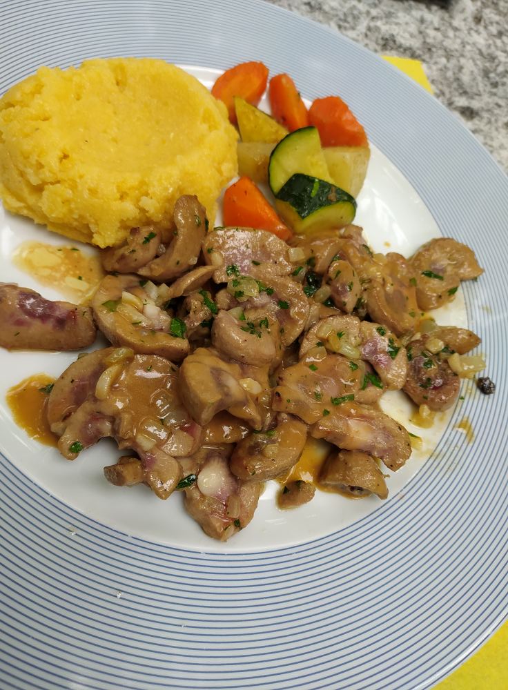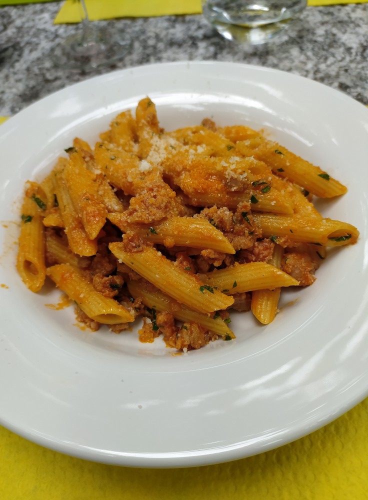 In Giornico in einem Grotto dei due Ponti: Penne mit Salciccia Ragu, danach Kalbsnieren mit Polenta