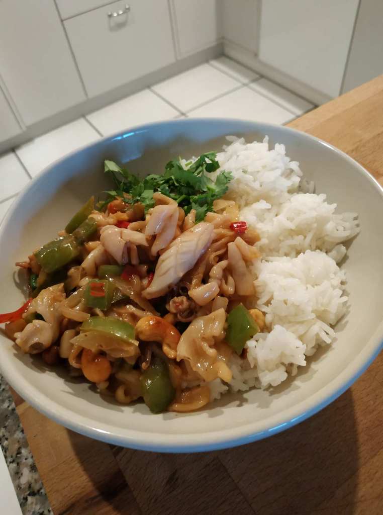 Thailändischer Tintenfisch mit Cashew, dazu Jasminreis