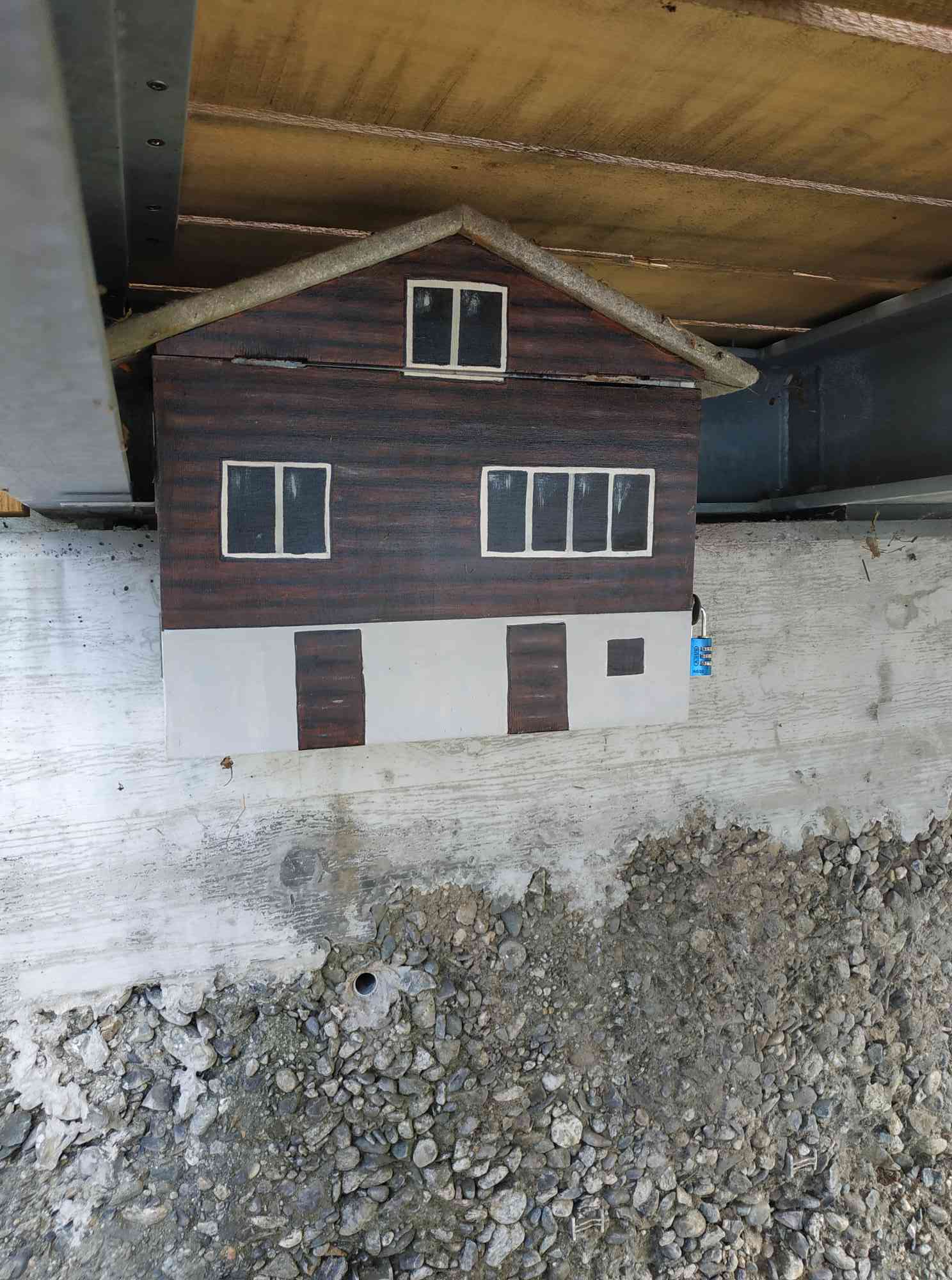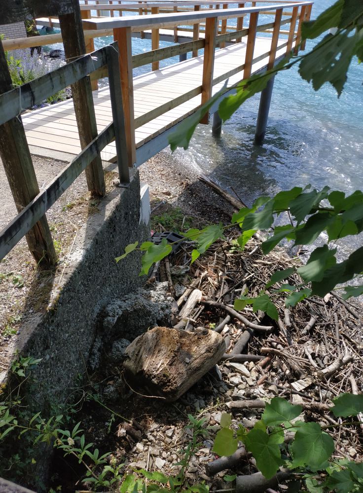 Cache Nr. 43 der Grand Tour der Suisse – Tellsplatte. Man musste übers Geländer und unter der Brücke war er dann – ja, das Häuschen. Rechts sieht man das Schloss, was ich auf machen musste.