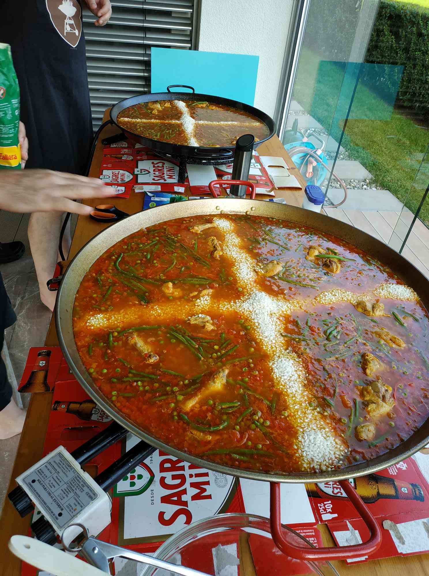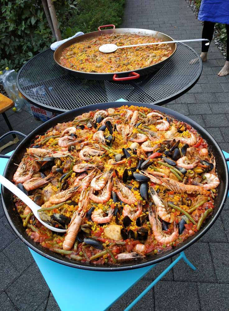 Für 28 Personen (ich wurde zum kochen engagiert) Paella. Also 2 große Pfannen, eine mit, eine ohne Meeresfrüchte