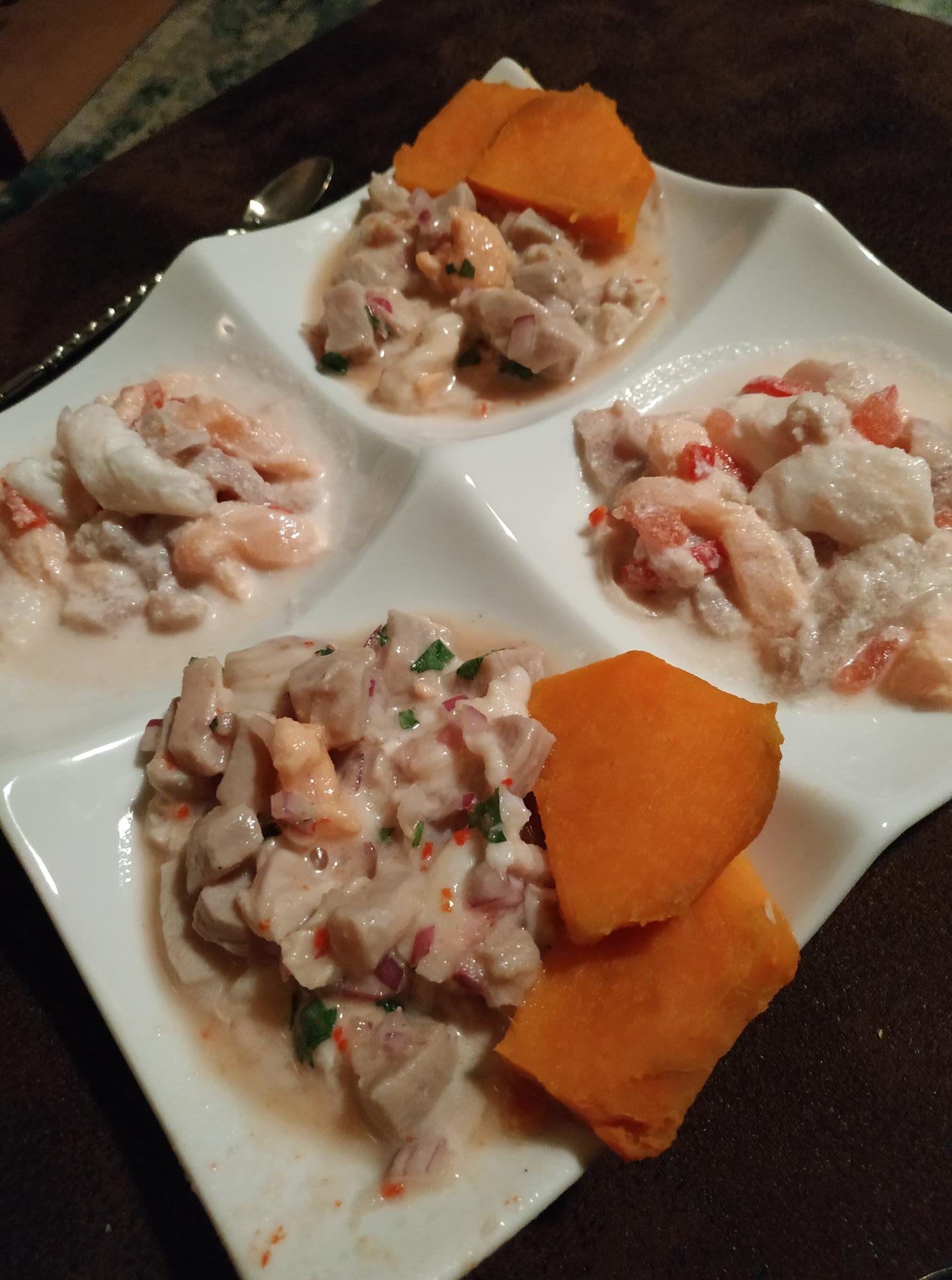 Fidschianischer Kokoda (Fischsalat), Ceviche Tipico, Austern mit zweierlei Vinaigrette (Dill/Essig etc. , die zweite Honig/Limette)