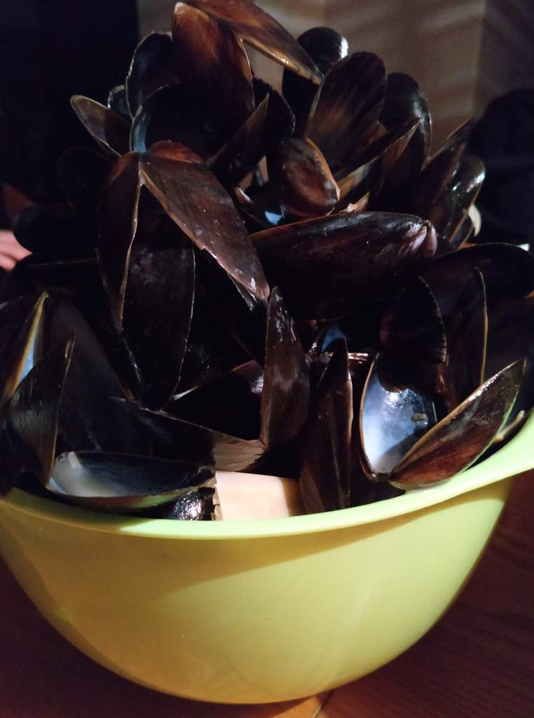 2 erlei Muscheln (klassisch mit Petersilie und Weisswein, asiatisch mit Kokosmilch, Koriander) hier nur noch die Schalen