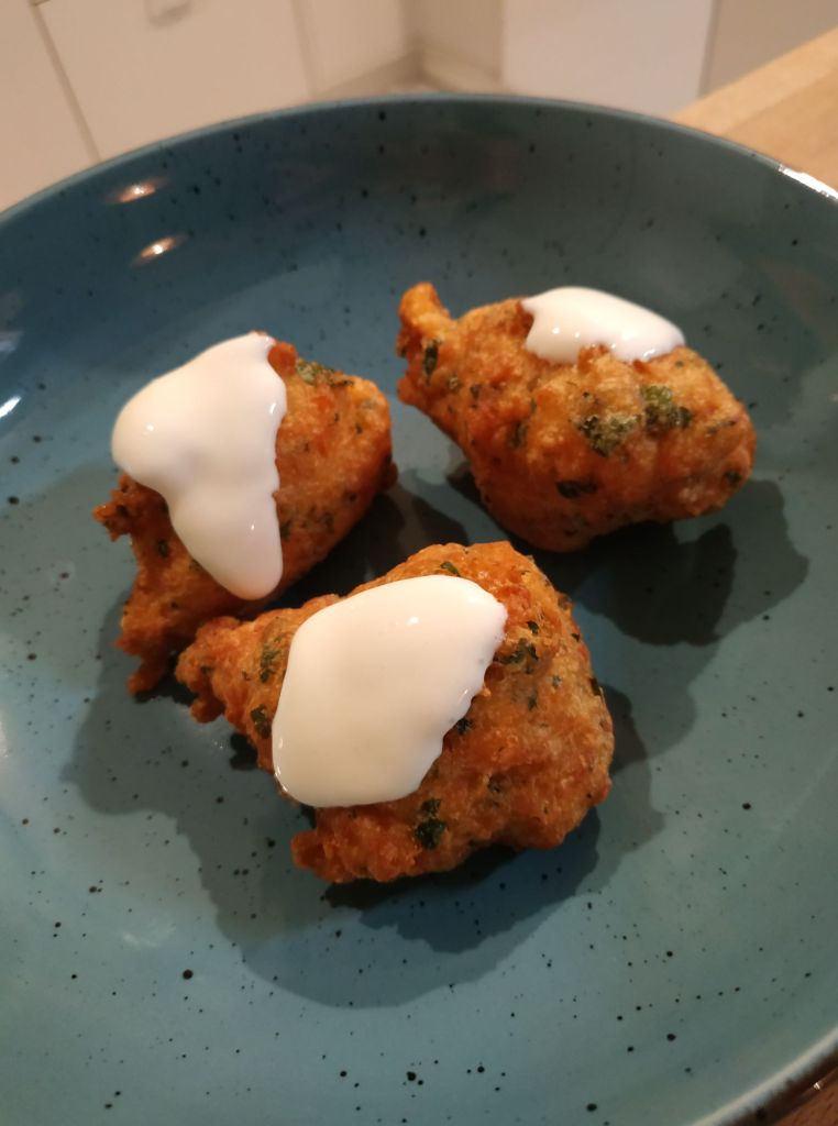 In dem portugiesischen Kochbuch (deswegen auch die Weine) für letzte Woche standen noch mehr Rezepte: Lissabonner Fischküchlein – Pataniscas de Bacalhau a moda Lisboeta (ich habe normalen Kabeljau genommen), dazu Aioli ohne Ei