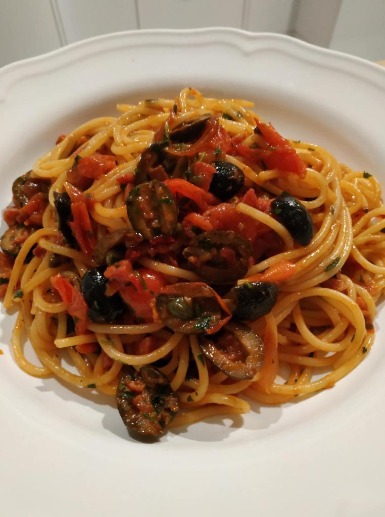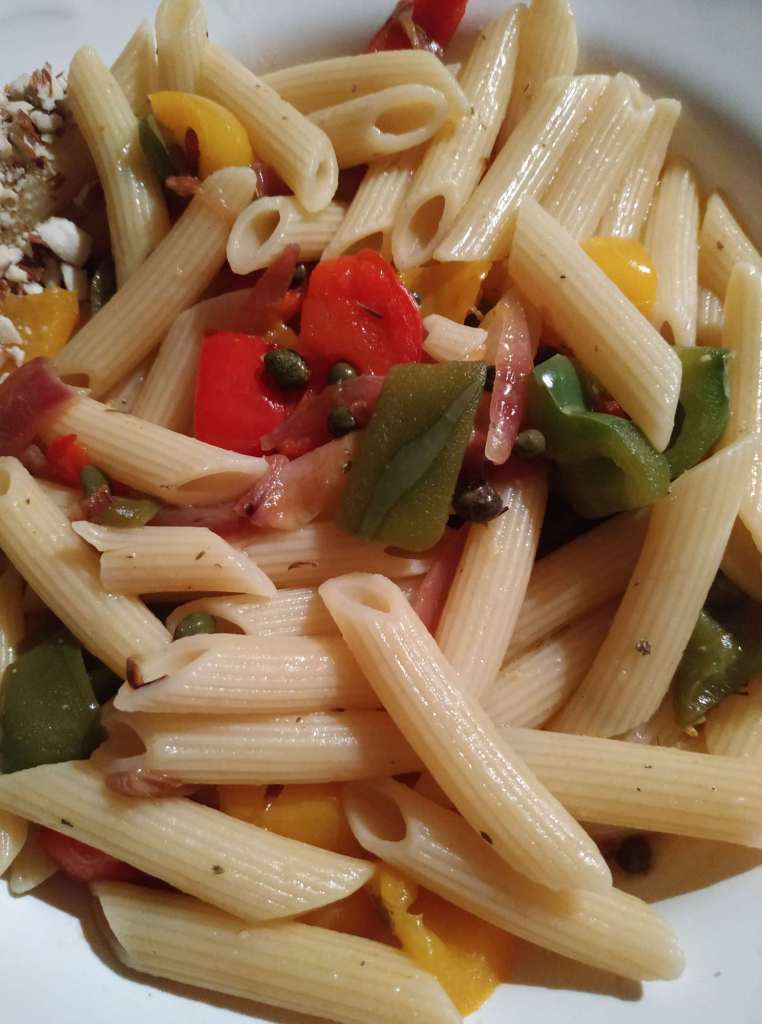 Peperonata Pasta (Pasta, Paprika, Zwiebeln, Kapern, Rosmarin, gehackte Mandeln)