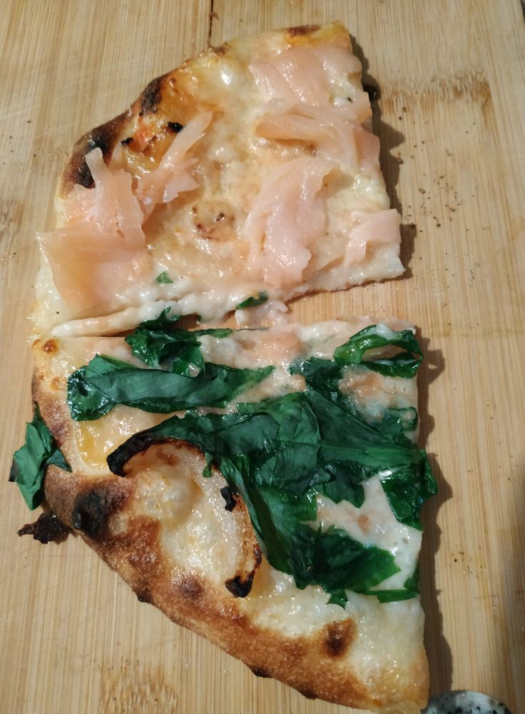 Pizza, eine davon – Lachs / Bärlauch, schmeckt sehr interessant nach Spinat mit Knoblauch