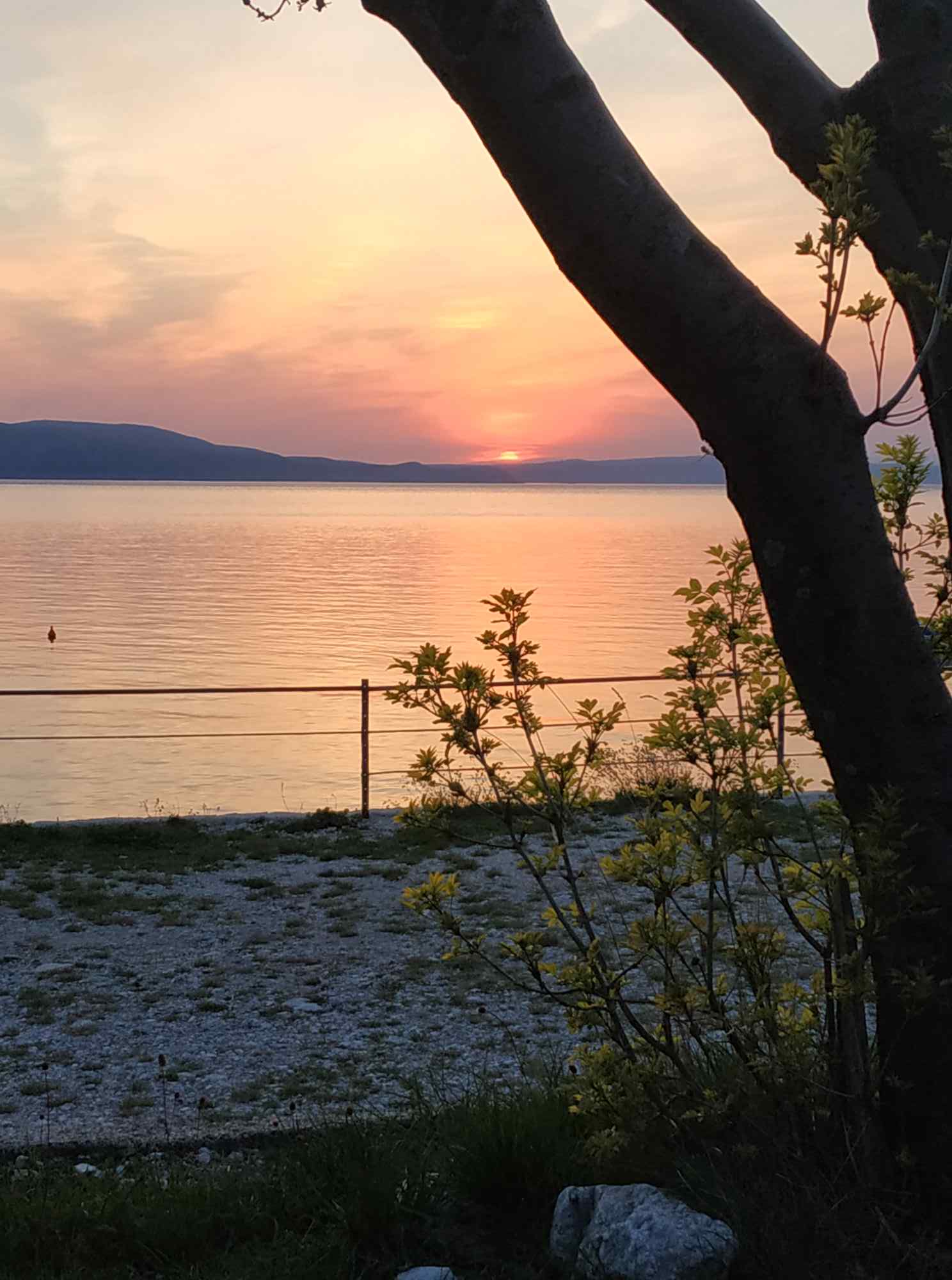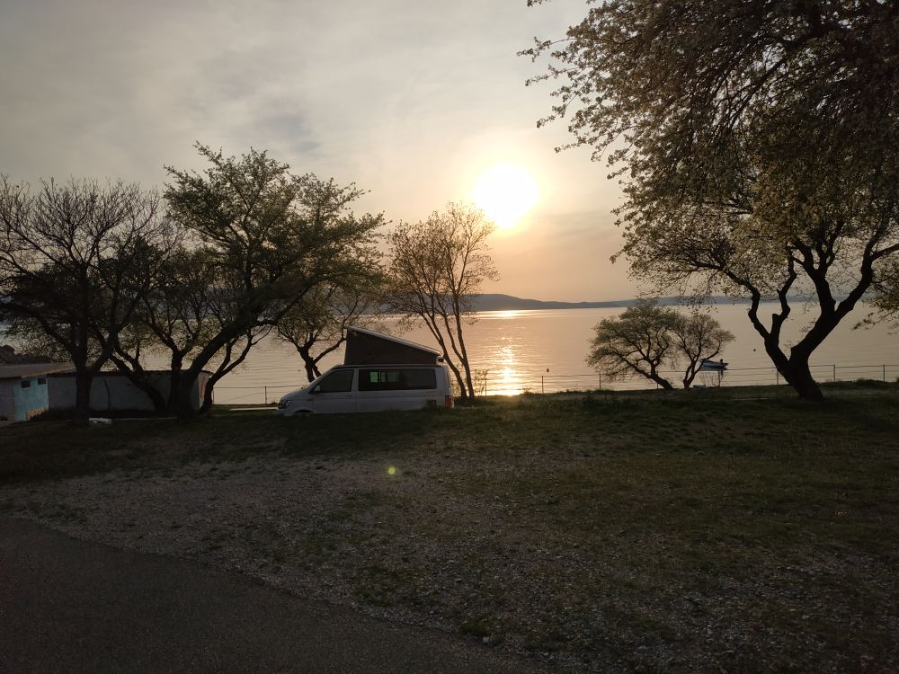 Sonnenuntergang auf dem Campingplatz – ich bin da die einzige, kann mit der Vorsaison zu tun haben, oder damit, dass der Platz leicht versifft ist und es keine funktionierenden Sanitäranlagen gibt. Aber hey – erste Reihe, ich allein, nur das Meer (5 Schritte) und der Sonnenuntergang. Wer denkt da schon ans waschen
