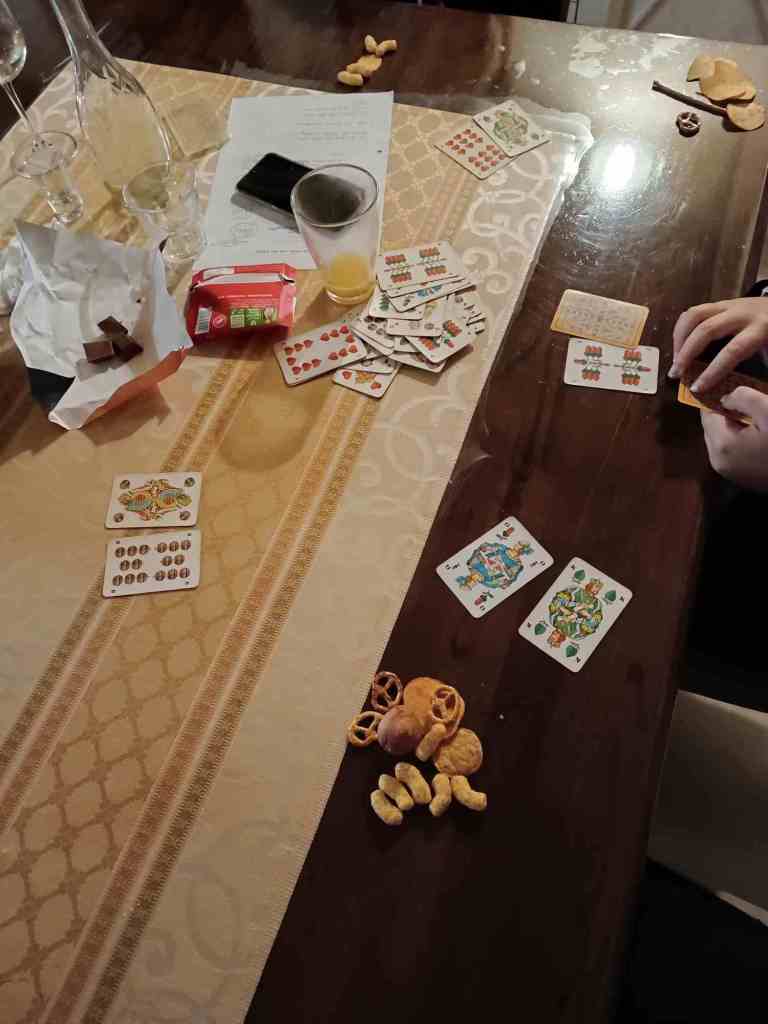 17 und 4 um Knapperzeug 😉 Es gab viele Diskussionen, wann ein Ass 1 oder 11 zählt. Ich guckte mit meinem Wein „stumm auf dem ganzen Tisch herum“