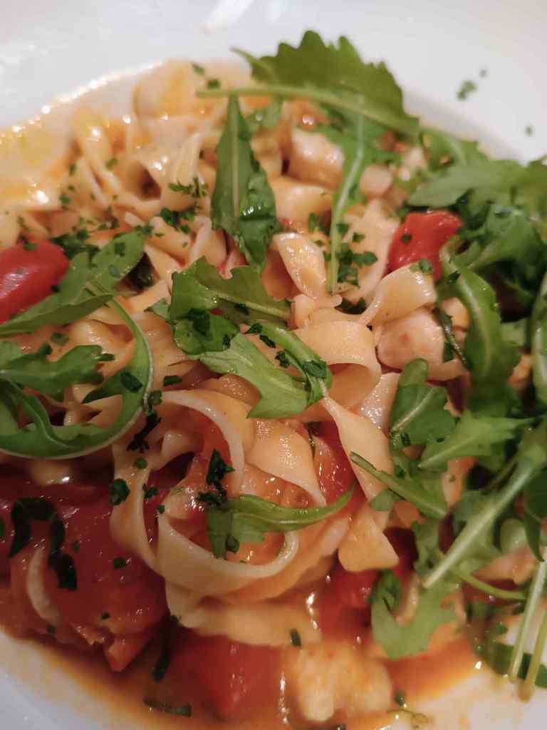 Gute Bekannte haben einen Gutschein für einen Italiener für 4 Personen und haben sich als wahre Freunde erwiesen, indem sie uns mitgenommen haben. Ich hatte Tagliatelle ligura – Bandnudeln mit Jacobsmuscheln und Rucola