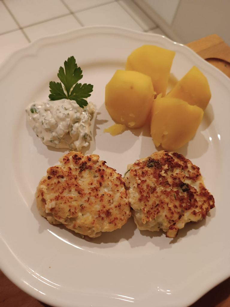 Fischküchlein (so heißt das lt. Rezept, sind aber letztendlich Fischburger) mit Kräuter-Joghurt Dip