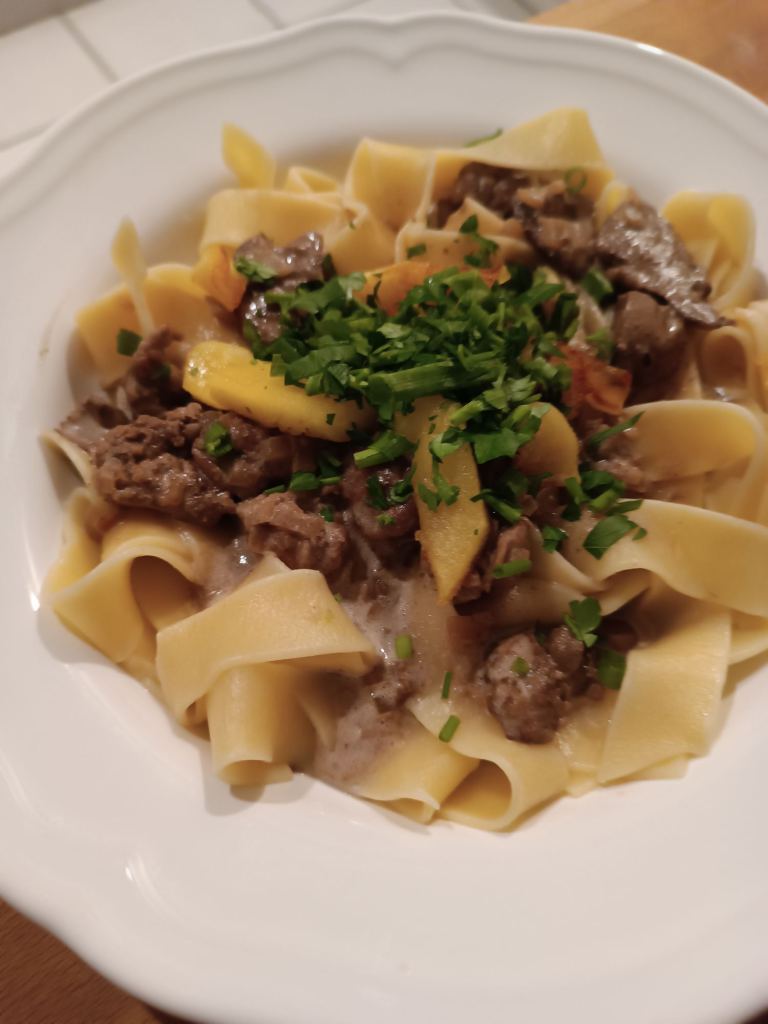 Hühnerleber sauer mit Bandnudeln (war echt gut!)