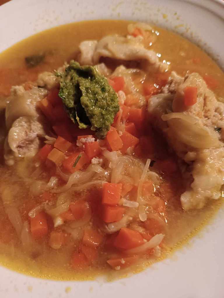 ich hatte ja vor längerer Zeit mal Maultaschen selber gemacht und einen Teil eingefroren. Daraus gabs dann heute eine Maultaschen Suppe mit Pesto. Sieht jetzt nicht gut aus, hat aber geschmeckt