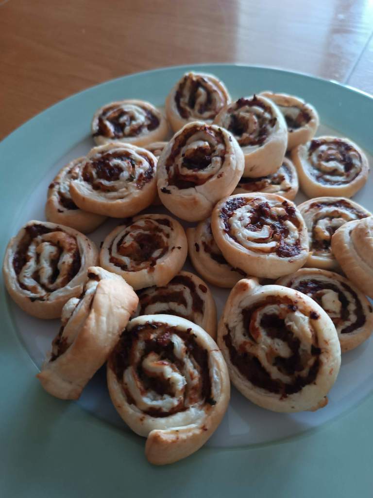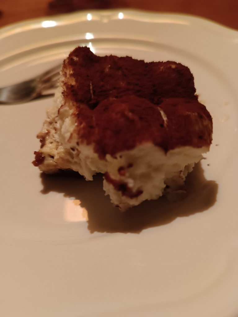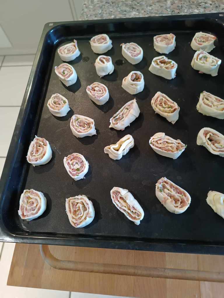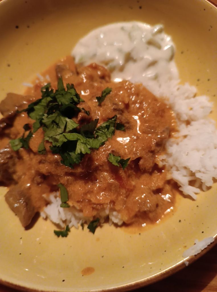 Zur Begrüßung Blätterteig Schnecken mit Wurstbrät, Abends Lammcurry, Reis, Raita. Zum Dessert (gekauftes) Tiramisu